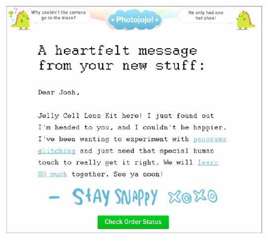 Different approaches to a typical notification—such as a shipping notice—can be small, but have a lasting impact over time. Small injections of humor to your customer’s day can build up to create a meaningful and memorable brand.